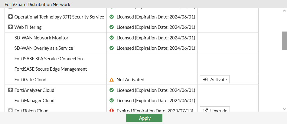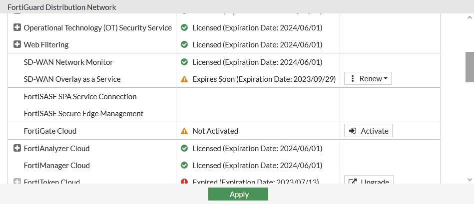 SD-WAN overlay is supported through an Overlay-as-a-Service (OaaS) license displayed as SD-WAN Overlay as a Service on the System > FortiGuard page. Each FortiGate used by the FortiCloud Overlay-as-a-Service or FortiGate Cloud portal for SD-WAN overlay must have this license applied to it.
