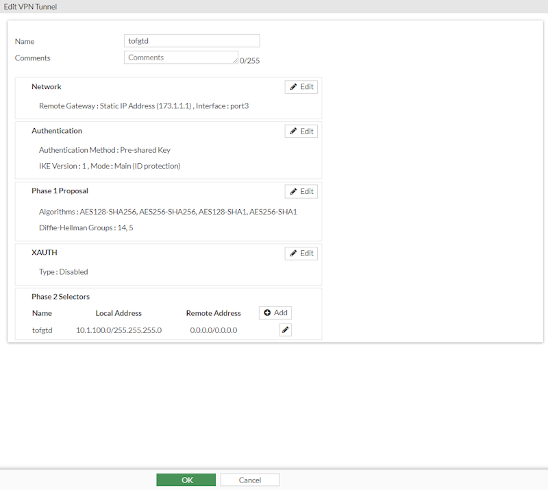 show config vpn ipsec phase1-interface edit "tofgtd-New" set interface "port3" set peertype any set net-device disable set proposal aes128-sha256 aes256-sha256 aes128-sha1 aes256-sha1 set dpd disable set remote-gw 173.1.1.1 ... next end -