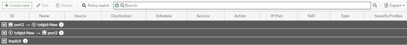config firewall policy show config firewall policy edit 1 set uuid 802c6c2e-8368-51ee-bf40-6c3c32da1024 set srcintf "port2" set dstintf "tofgtd-New" set action accept ... next edit 2 set uuid 80d136aa-8368-51ee-cc52-b0b06306fb80 set srcintf "tofgtd-New" set dstintf "port2" set action accept ... next end