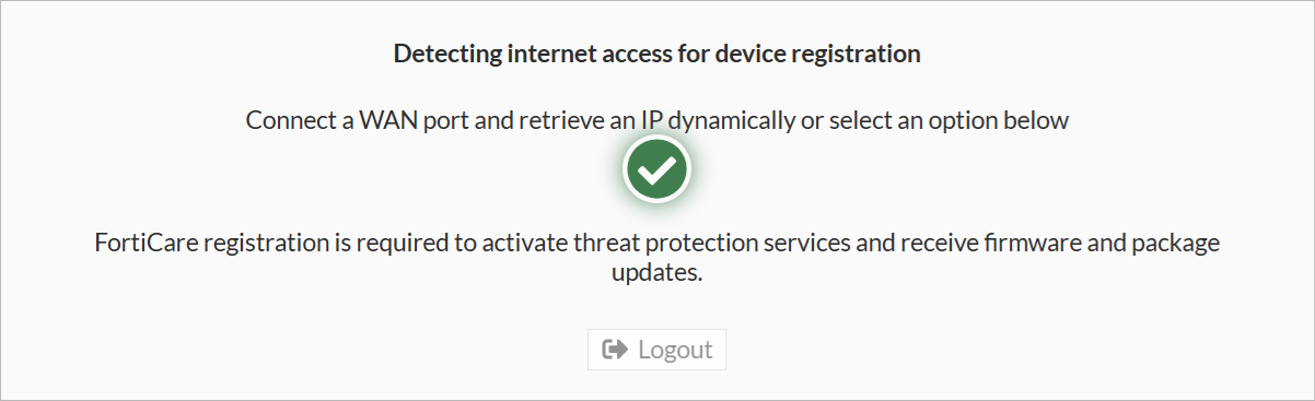 After you log in, FortiOS checks for an internet connection, and next steps depend on your FortiGate model: