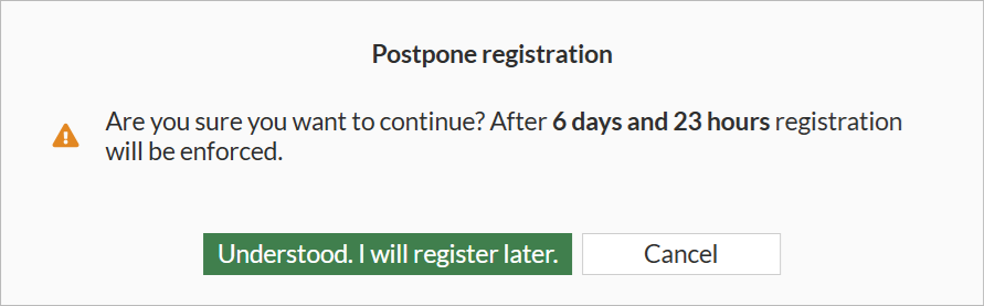 When the device is not registered or configured for internet after seven days of uptime, the seven-day setup period expires, and the Postpone registration button is grayed out.