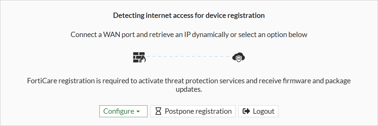 After logging in to FortiOS for the first time and the Detecting internet access for device registration dialog box is displayed, click Postpone registration.