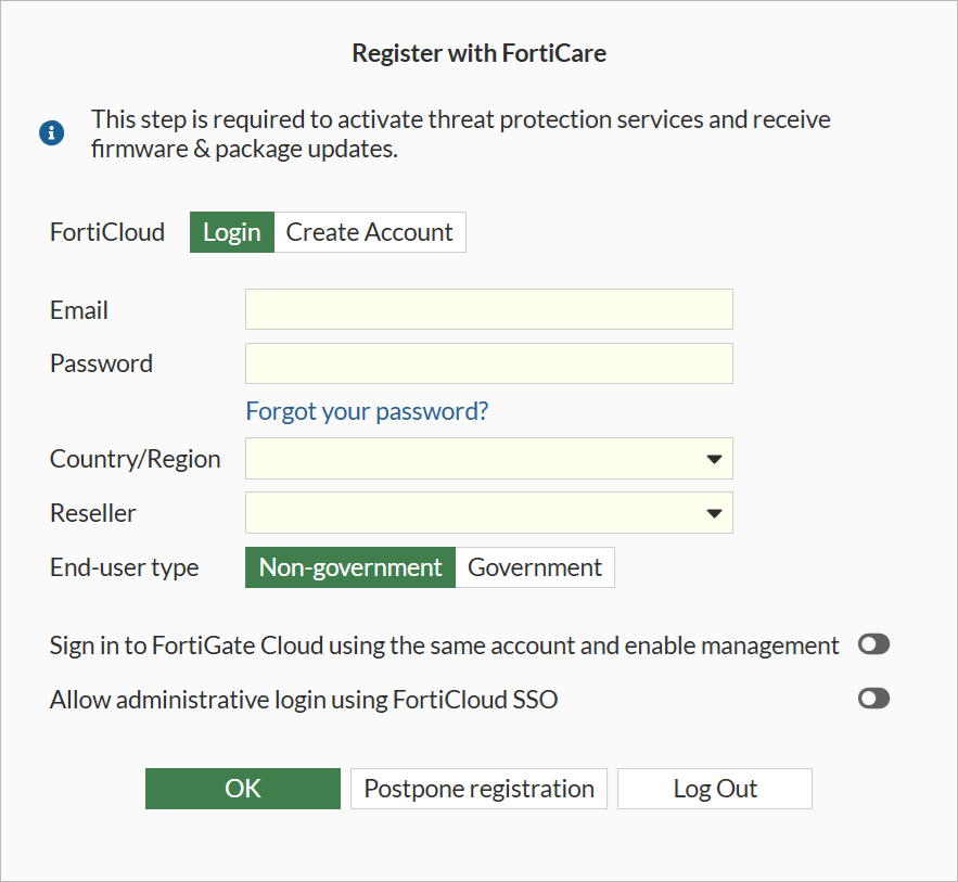 After the seven-day setup period ends, the Postpone registration button is no longer available, and you must register with FortiCare or log out.