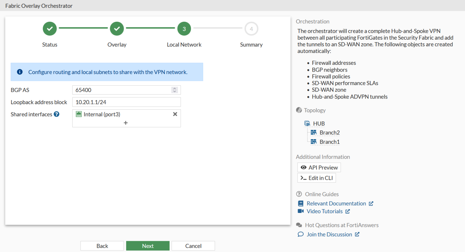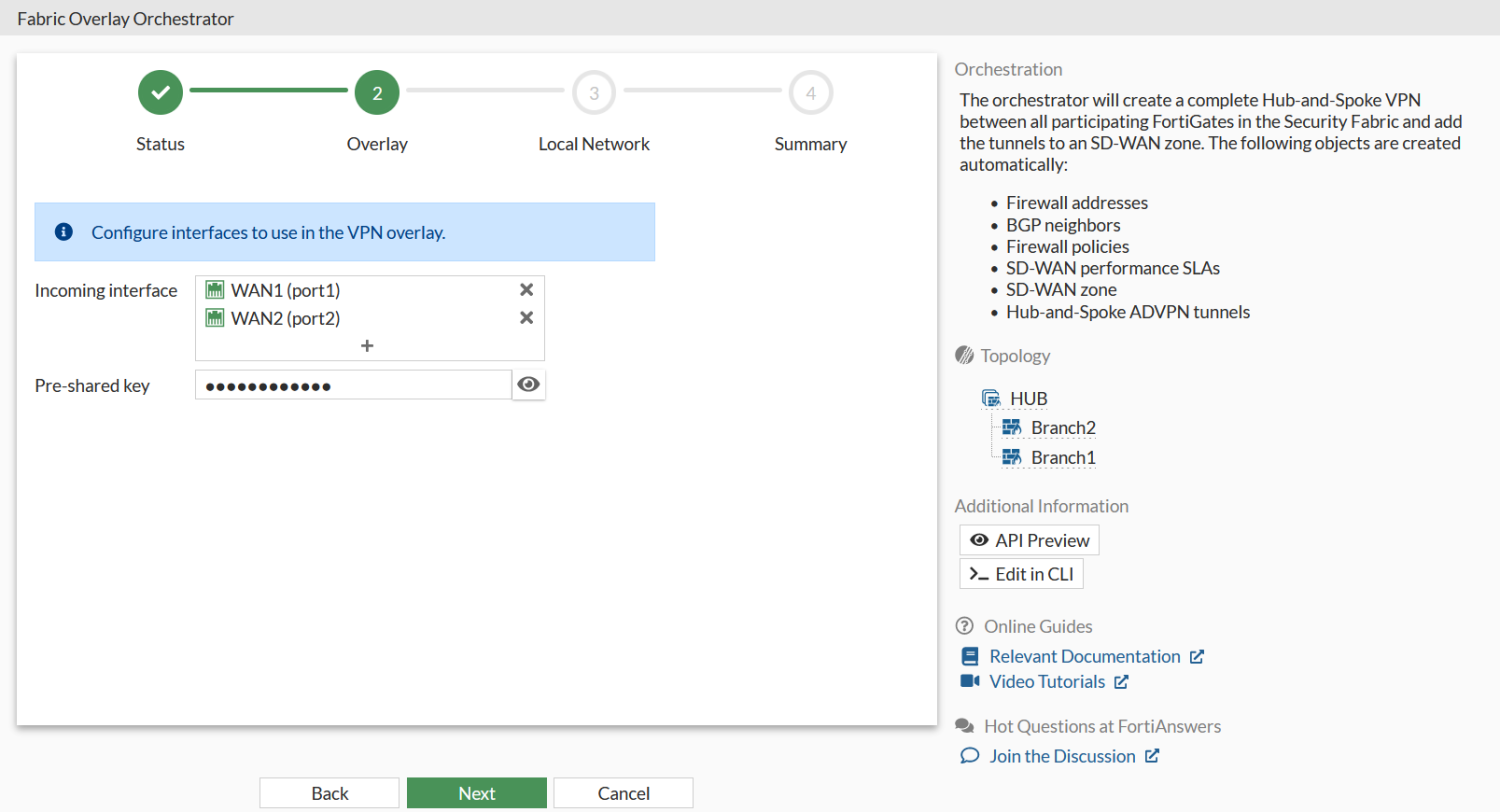 The following steps should be used to configure a self-orchestrated SD-WAN overlay within a single Security Fabric. These steps must be followed in order, and assume that the prerequisites and network topology are in place.