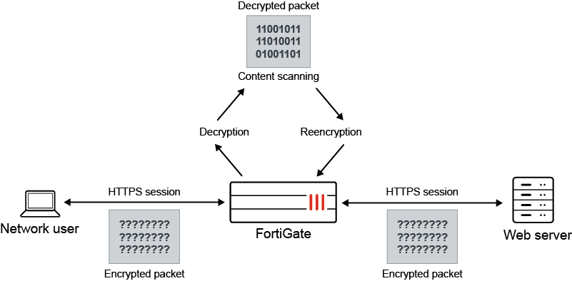 When you use deep inspection, the FortiGate impersonates the recipient of the originating SSL session, then decrypts and inspects the content to find threats and block them. It then re-encrypts the content and sends it to the real recipient.