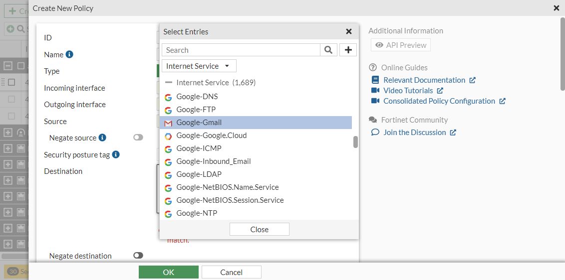 In the Select Entries pane, select Internet Service from the dropdown list and select Google-Gmail.