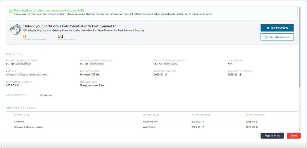 The two FortiGate serial numbers will be associated together on FortiCare to create one virtual serial number (vSN). If multiple pairs of devices are ordered, each pair will be together in its own box to help identify the associated devices. The aforementioned services will then be registered to the vSN. A la carte SKUs are not supported, and cannot be registered to the vSN.