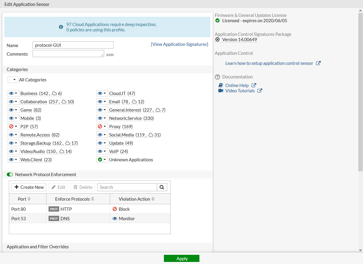 In the following example, an application sensor is configured to enforce HTTP on port 80 (block), and DNS on port 53 (monitor).