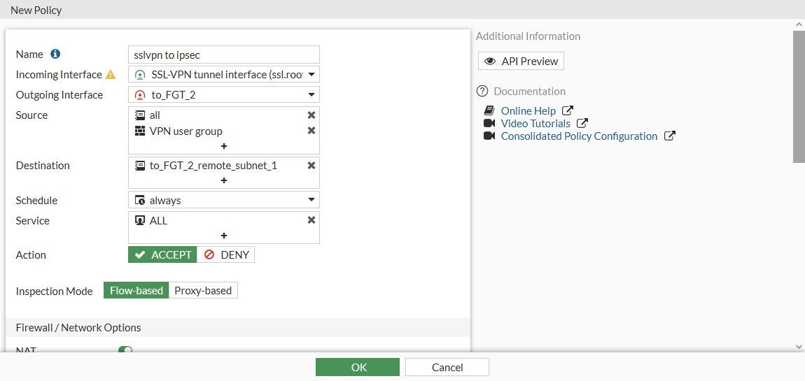 - Click Create New to create a policy that allows SSL VPN users access to the IPsec VPN tunnel.