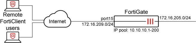 In this example, endpoint users dial up using FortiClient to create IPSec tunnels with the FortiGate and obtain IP addresses. The link monitor on the FortiGate's dynamic VPN interface detects the path quality to the endpoints.