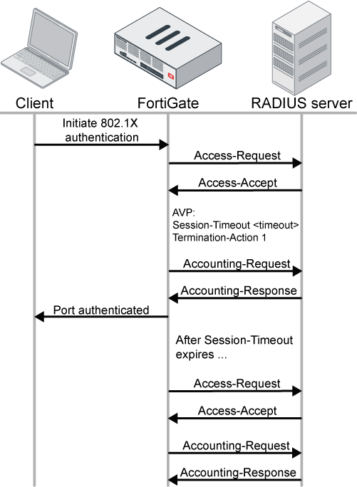 In a wired scenario, a hardware switch configured with 802.1X security authentication can read the Termination-Action attribute value from the RADIUS Access-Accept response. If the Termination-Action is 1, the FortiGate will initiate re-authentication when the session time has expired. During re-authentication, the port stays authorized. If the Termination-Action is 0, the session will be terminated.