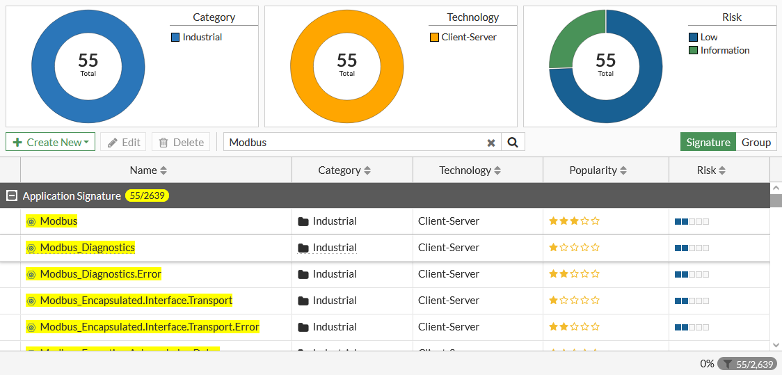 Modbus application control signatures are listed on Security Profiles > Application Signatures. Search for Modbus to see the Modbus signatures, such as Modbus_Diagnostics and Modbus_Read.Coils.
