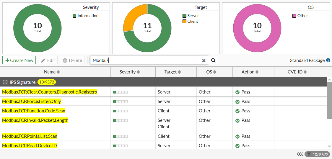 Modbus vulnerability protection signatures are listed on Security Profiles > IPS Signatures. Search for Modbus to see the Modbus signatures.