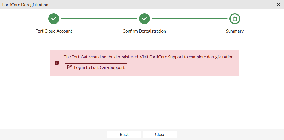 If the FortiGate has been registered for less then three years, the deregistration will fail:
