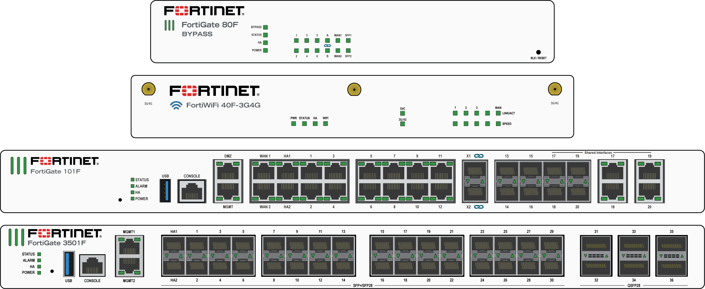 The following faceplates show examples of where the LEDs are typically found on FortiGate models: