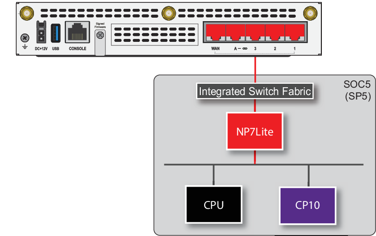 The SOC5 includes an integrated switch fabric (ISF) that connects all of the front panel network interfaces to the NP7Lite processor. The SOC5 ISF allows sessions passing between any FortiGate front panel interface pair to be offloaded by the NP7Lite processor. The SOC5 ISF also allows you to use the command config system virtual-switch to create a virtual hardware switch that can include any front panel interface connected to the SOC5.