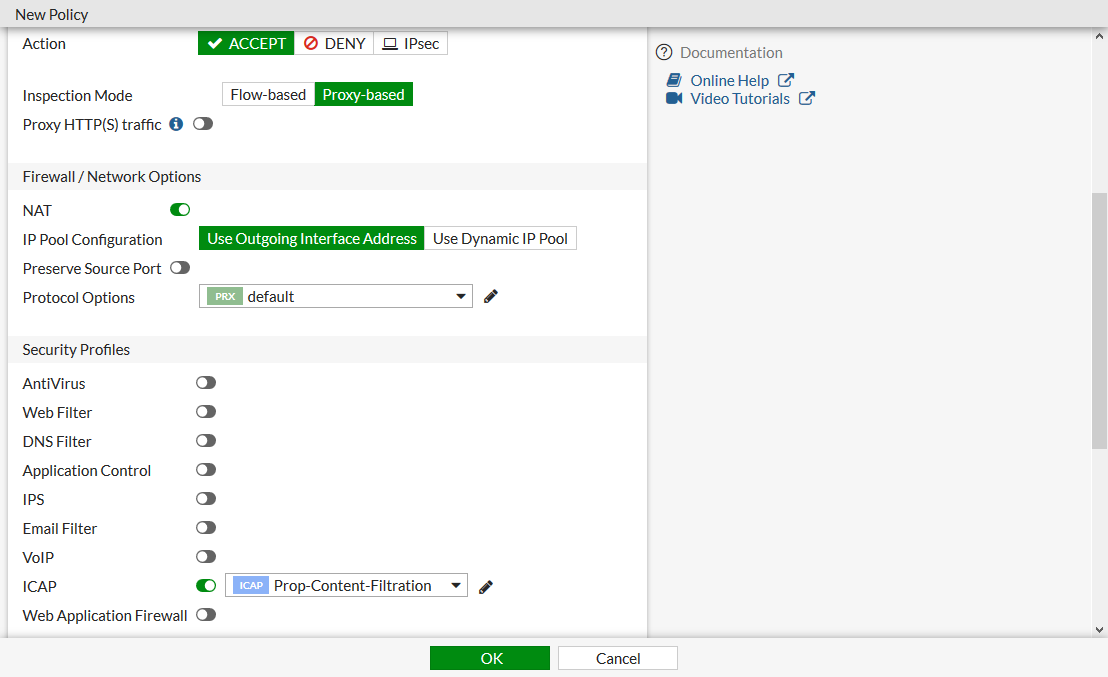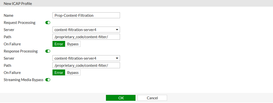 config icap profile edit "Prop-Content-Filtration" set request enable set response enable set streaming-content-bypass enable set request-server "content-filtration-server4" set response-server "content-filtration-server4" set request-failure error set response-failure error set request-path "/proprietary_code/content-filter/" set response-path "/proprietary_code/content-filter/" set methods delete get head options post put trace other next end - Add the ICAP profile to a policy: