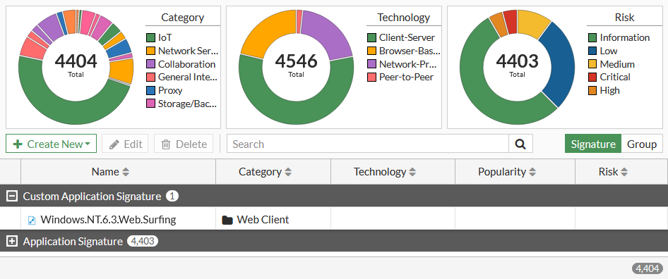 F-SBID( --attack_id 6483; --name "Windows.NT.6.3.Web.Surfing"; --default_action drop_session; --service HTTP; --protocol tcp; --app_cat 25; --flow from_client; --pattern !"FCT"; --pattern "Windows NT 6.3"; --no_case; --context header; --weight 40; )This signature scans HTTP and HTTPS traffic that matches the pattern Windows NT 6.3 in its header. For blocking older versions of Windows, such as Windows XP, you would use the pattern Windows NT 5.1. An attack ID is automatically generated when the signature is created.