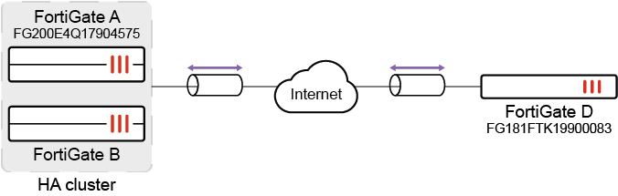 In this example, FortiGates A and B are in an HA cluster, so the serial numbers will not exchange after failover. The cluster is connected to FortiGate D through IPsec VPN.