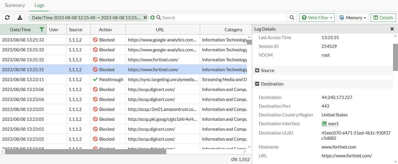 # execute log filter category utm-webfilter # execute log display 4: date=2023-08-08 time=13:25:31 eventtime=1691526331836645153 tz="-0700" logid="0316013056" type="utm" subtype="webfilter" eventtype="ftgd_blk" level="warning" vd="root" policyid=1 poluuid="4a4b9d00-e471-51ed-71ec-c1a3bc8f773c" policytype="policy" sessionid=254529 srcip=1.1.1.2 srcport=60836 srccountry="Australia" srcintf="internal7" srcintfrole="lan" srcuuid="45eec070-e471-51ed-4b1c-930f37c5d882" dstip=44.240.173.227 dstport=443 dstcountry="United States" dstintf="wan1" dstintfrole="wan" dstuuid="45eec070-e471-51ed-4b1c-930f37c5d882" proto=6 service="HTTPS" hostname="www.fortinet.com" profile="default" action="blocked" reqtype="direct" url="https://www.fortinet.com/" sentbyte=517 rcvdbyte=0 direction="outgoing" msg="URL belongs to a denied category in policy" ratemethod="domain" cat=52 catdesc="Information Technology"