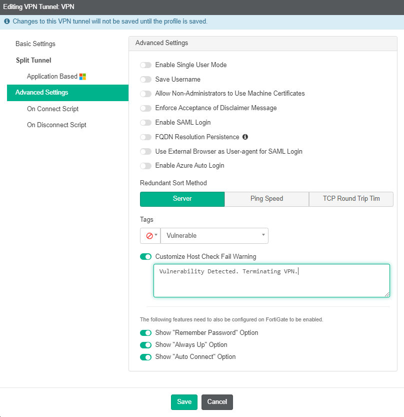 After the next communication between FortiClient EMS and FortiClient, endpoints with this profile applied are unable to connect to this VPN tunnel if they have critical vulnerabilities.