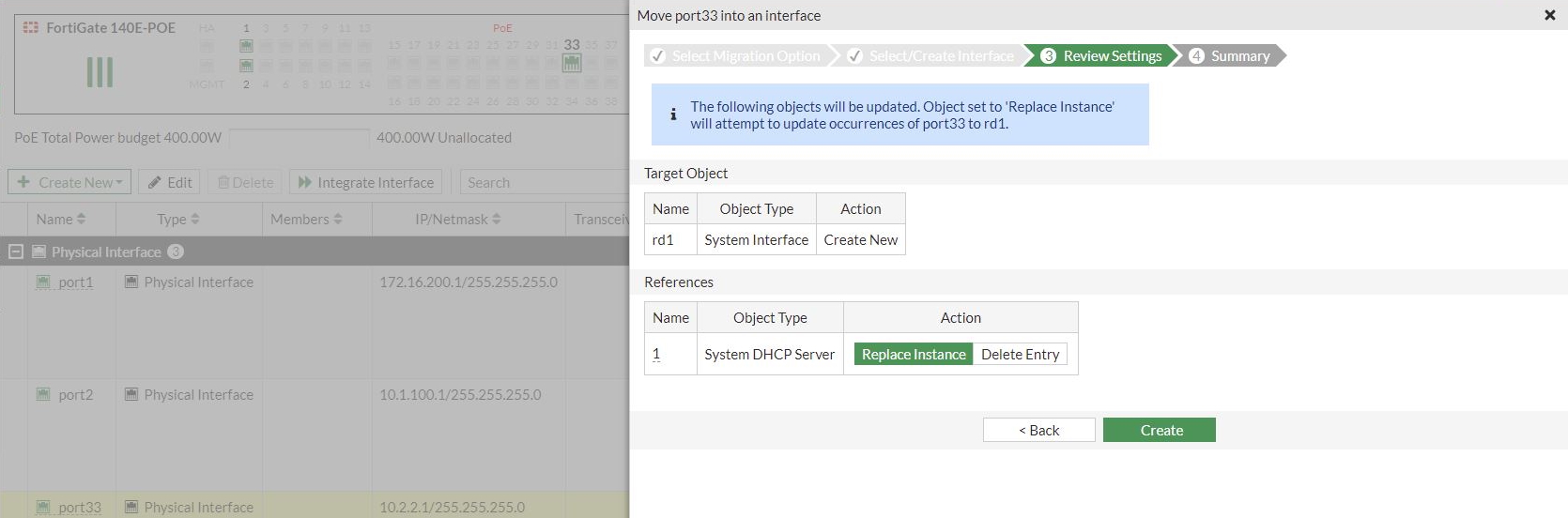 The Integrate Interface option on the Network > Interfaces page helps migrate a physical port into another interface or interface type such as aggregate, software switch, redundant, zone, or SD-WAN zone. The FortiGate will migrate object references either by replacing the existing instance with the new interface, or deleting the existing instance based on the user's choice. Users can also change the VLAN ID of existing VLAN sub-interface or FortiSwitch VLANs.
