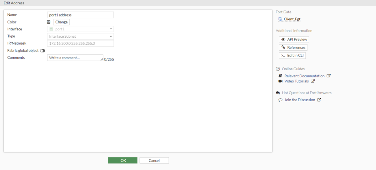 Interface subnet addresses are automatically created when Role is set to LAN or DMZ in the Interface page, or you can manually configure interface subnet addresses in the CLI. You cannot choose Interface Subnet in the GUI when creating the address, but after the address is created, Interface Subnet displays in the GUI. However, all the settings are grayed out, except Name and Comments, which can be edited.