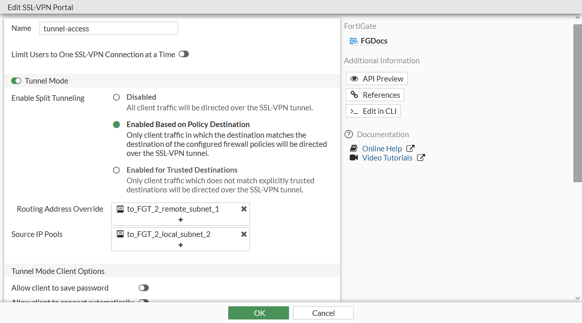 Turn on Enable Split Tunneling so that only traffic intended for the local or remote networks flow through FGT_1 and follows corporate security profiles.
