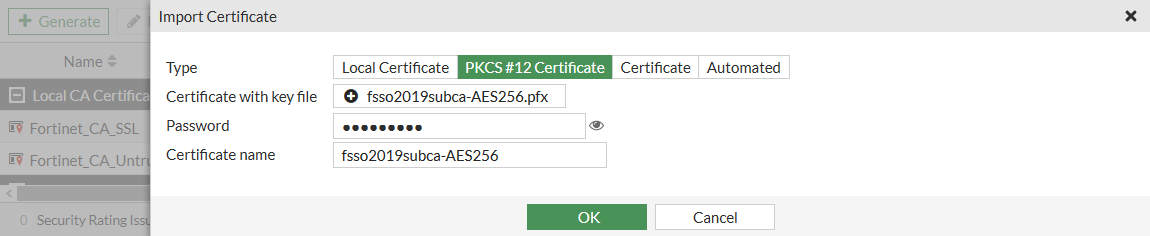 execute vpn certificate local import tftp fsso2019subca-AES256.pfx <tftp_IP> p12 <password>