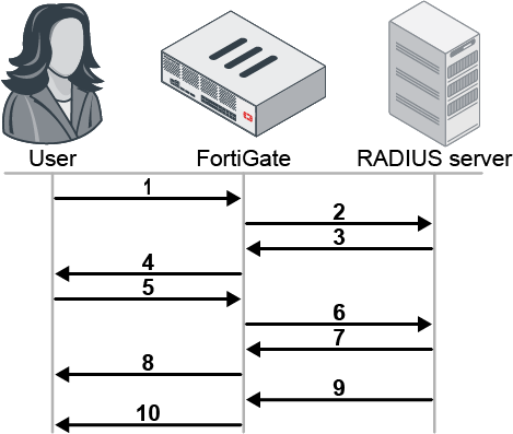 The FortiGate sends the Access-Request message to the RADIUS server.