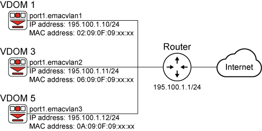In this example, a FortiGate is connected, through port 1 to a router that’s connected to the Internet. Three VDOMs share the same interface (port 1) which connects to the same router that’s connected to the Internet. Three enhanced MAC VLAN interfaces are configured on port 1 for the three VDOMs. The enhanced MAC VLAN interfaces are in the same IP subnet segment and each have unique MAC addresses.