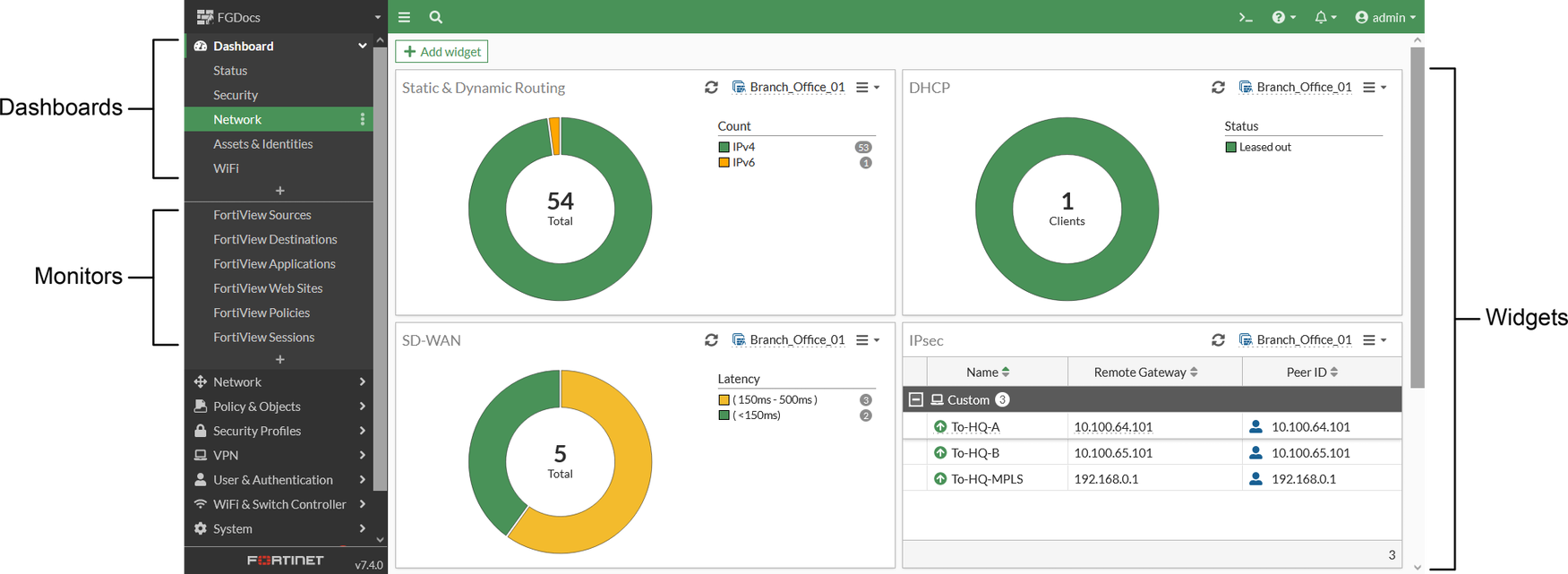 FortiOS includes predefined dashboards so administrators can easily monitor device inventory, security threats, traffic, and network health. You can customize the appearance of a default dashboard to display data pertinent to your Security Fabric or combine widgets to create custom dashboards. Many dashboards also allow you to switch views between Fabric devices.