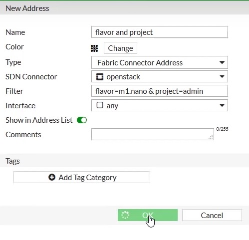 No matter what changes occur to the instances, the SDN connector populates and updates the changes automatically based on the specified filtering condition so that administrators do not need to reconfigure the address content manually. Appropriate firewall policies using the address are applied to instances that are members of the address.