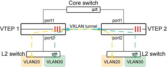 In this topology, a FortiGate (VTEP 1) is configured with a VXLAN interface over port1 where the remote-ip points to port1 of VTEP 2. The VXLAN interface is combined with port2 into the same L2 network using a virtual wire pair. The virtual wire pair allows wildcard VLANs to pass, which allows VLAN tags to be encapsulated over VXLAN. As a result, VLANs can span different switches over VXLAN.