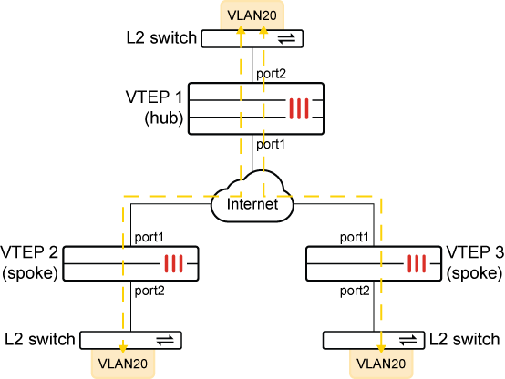 In this topology, an IPsec VPN hub and spoke overlay network is already configured between sites. To allow networks behind the hub and spokes to be connected together, each spoke has a VXLAN connection to the hub, and the hub allows interconnection between its private network and each of the VXLAN interfaces to the spokes. In this scenario, the private networks behind each spoke are actually on the same L2 network as the private network behind the hub.