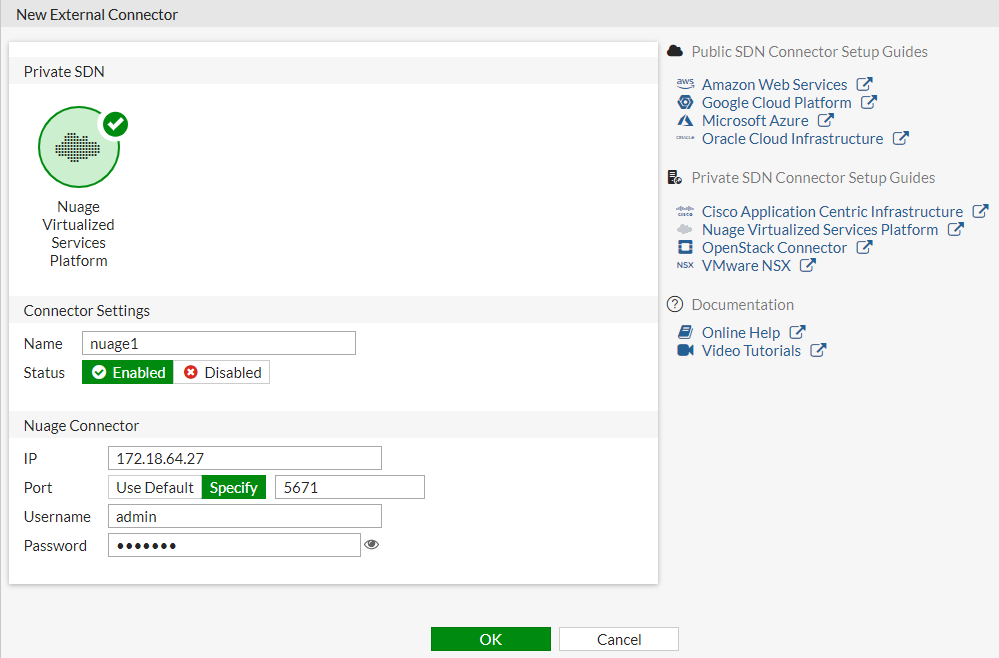 The Fortinet SDN Connector for Cisco ACI and Nuage Networks is a standalone connector that connects to SDN controllers within Cisco ACI and Nuage Networks. You must configure a connection to the Fortinet SDN connector in FortiOS to query the dynamic addresses.