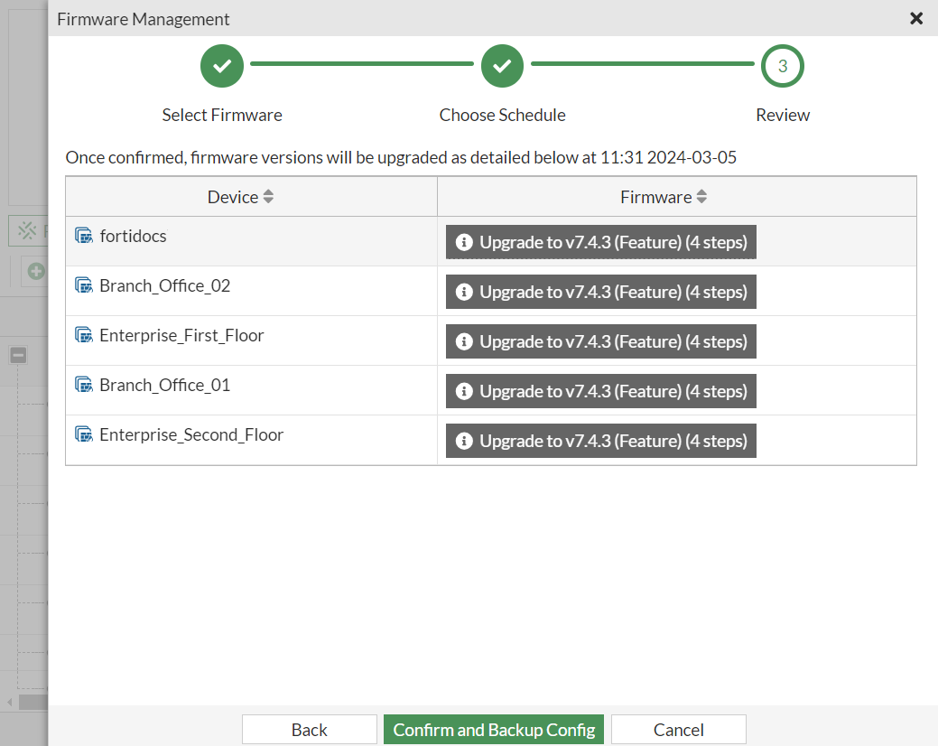 The pane enters a loading state to wait for all FortiGate configurations to save. Once completed, the pane closes and the device list refreshes to reflect the latest changes. In this example, the next step is to start the first step in the upgrade path on a schedule.