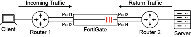 In this scenario, a session is established between port1 and port3. When the return traffic hits port4:
