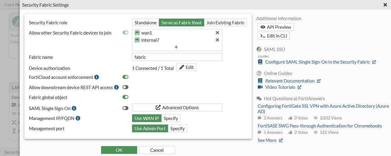 Go to Security Fabric > Fabric Connectors and double-click the Security Fabric Setup card.