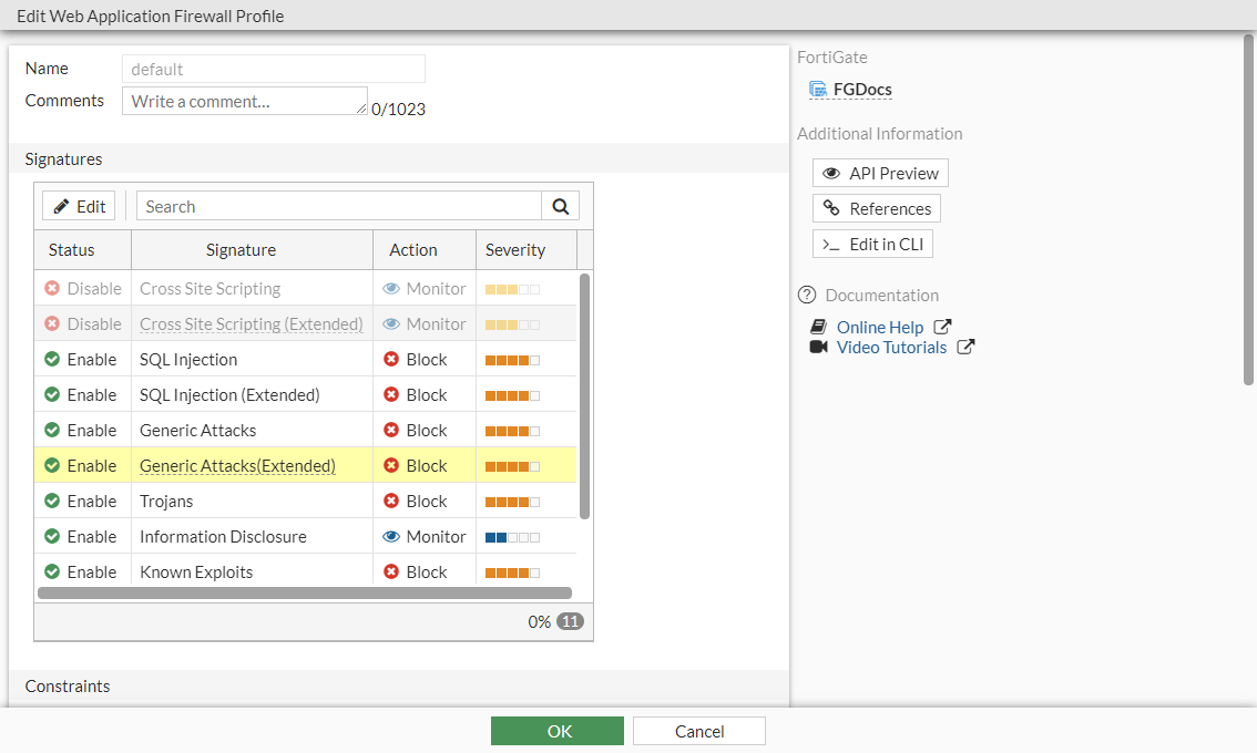 Web application firewall profiles are created with a variety of options called signatures and constraints. Once these options are enabled, the action can be set to allow, monitor, or block. The severity can be set to high, medium, or low.