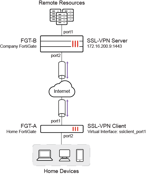 In this example, the home FortiGate (FGT-A) is configured as an SSL VPN client, and the company FortiGate (FGT-B) is configured as an SSL VPN server. After FGT-A connects to FGT-B, the devices that are connected to FGT-A can access the resources behind FGT-B.