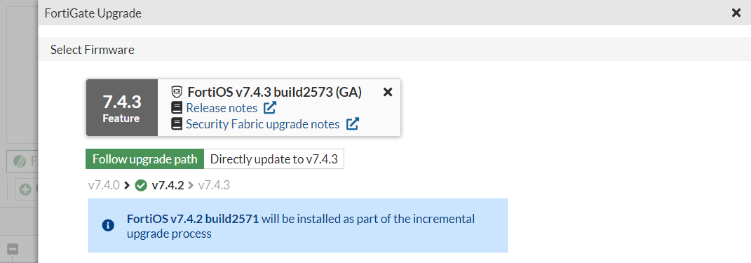 When you follow the upgrade path, FortiGate automatically completes the upgrades, including any required reboots, by downloading the chosen firmware directly from FortiGuard. In this example, FortiGate automatically upgrades to each firmware in the upgrade path, which is 7.4.2 and then 7.4.3.