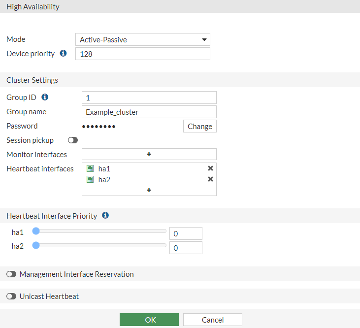 config system ha set mode a-p set group-id 1 set group-name Example_cluster set password ******** set hbdev ha1 10 ha2 20 end -