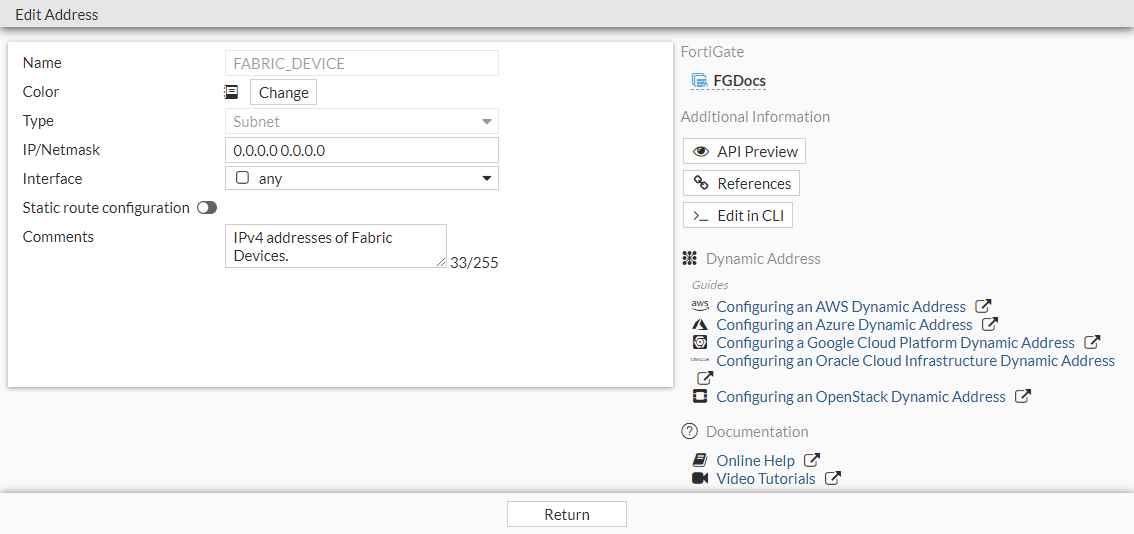The list of firewall addresses includes a default address object called FABRIC_DEVICE. You can apply the FABRIC_DEVICE object to the following types of policies: