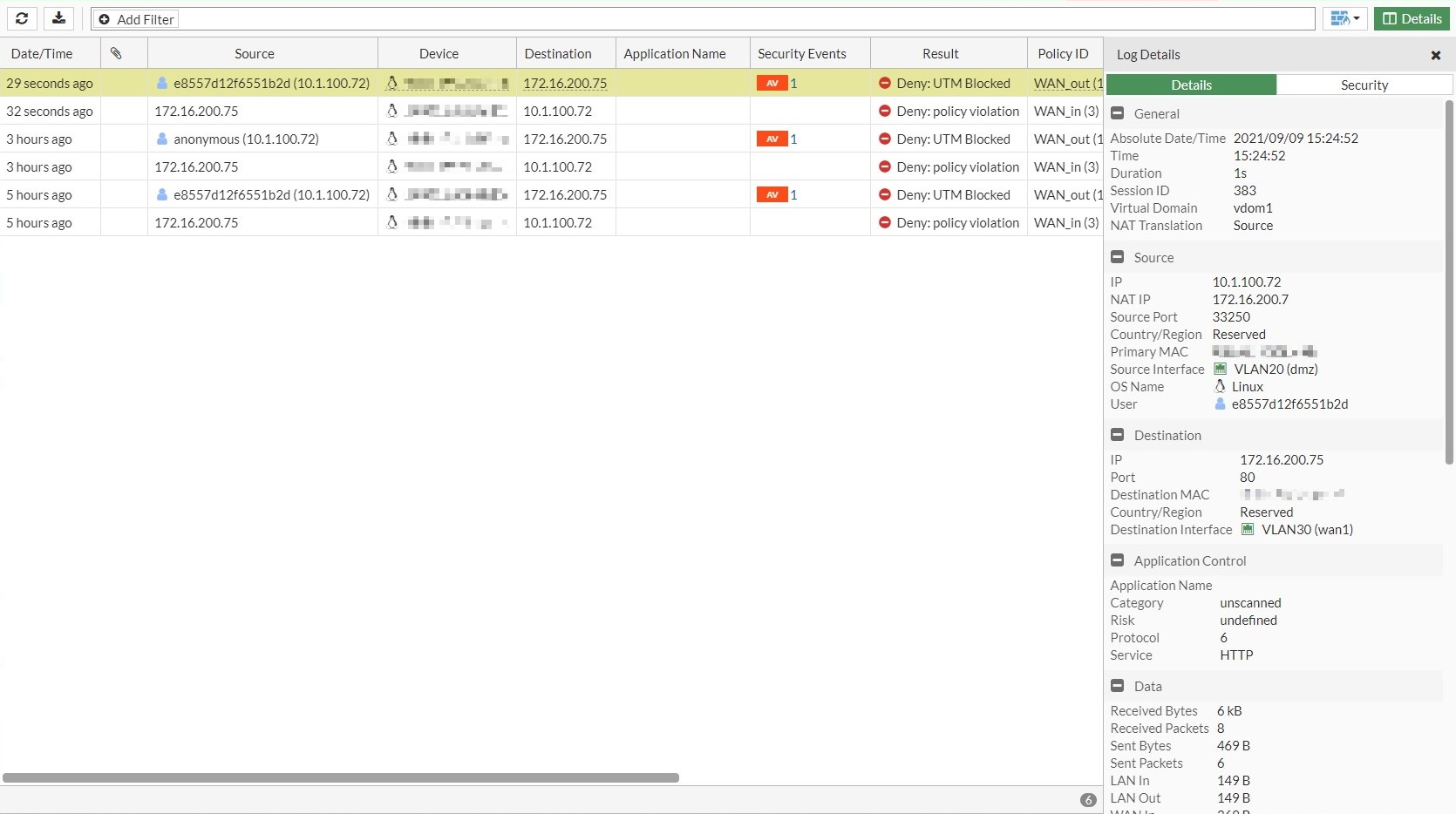 date=2021-09-09 time=11:27:44 eventtime=1631212064444723180 tz="-0700" logid="0000000013" type="traffic" subtype="forward" level="notice" vd="vdom1" srcip=10.1.100.72 srcport=33246 srcintf="dmz" srcintfrole="undefined" dstip=172.16.200.75 dstport=80 dstintf="wan1" dstintfrole="undefined" srccountry="Reserved" dstcountry="Reserved" sessionid=1337 proto=6 action="client-rst" policyid=1 policytype="policy" poluuid="12f6f924-c2fb-51eb-6e06-3b997d55d5f4" policyname="WAN_out" user="anonymous" dstuser="anonymous" service="HTTP" trandisp="snat" transip=172.16.200.7 transport=33246 duration=1 sentbyte=469 rcvdbyte=6331 sentpkt=6 rcvdpkt=8 appcat="unscanned" wanin=369 wanout=149 lanin=149 lanout=149 utmaction="block" countav=1 crscore=50 craction=2 srchwvendor="VMware" osname="Linux" mastersrcmac="**:**:**:**:**:**" srcmac="**:**:**:**:**:**" srcserver=0 dsthwvendor="VMware" dstosname="Linux" masterdstmac="**:**:**:**:**:**" dstmac="**:**:**:**:**:**" dstserver=0 utmref=0-14