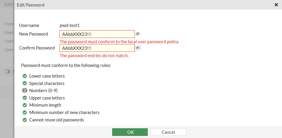 config user local edit pwd-test1 set passwd CCbXsetp23!!! New password must conform to the password policy enforced on this user: Password must: Be a minimum length of 8 Include at least 1 lower case letter(s) (a-z) Include at least 1 upper case letter(s) (A-Z) Include at least 3 non-alphanumeric character(s) Include at least 3 number(s) (0-9) Have at least 2 unique character(s) which don't exist in the old password Not be same as last two passwords node_check_object fail! for passwd CCbXsetp23!!! value parse error before 'CCbXsetp23!!!' Command fail. Return code -49 -