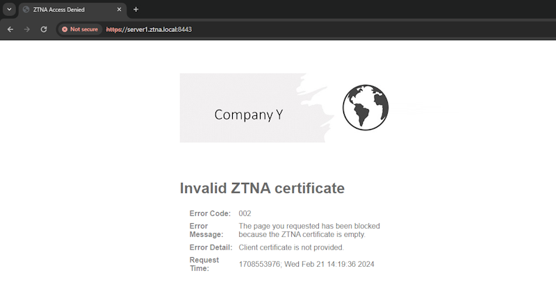When a client fails to access the ZTNA virtual host named server1.ztna.local because of an empty certificate error, the following custom replacement message with the Company Y logo is displayed.