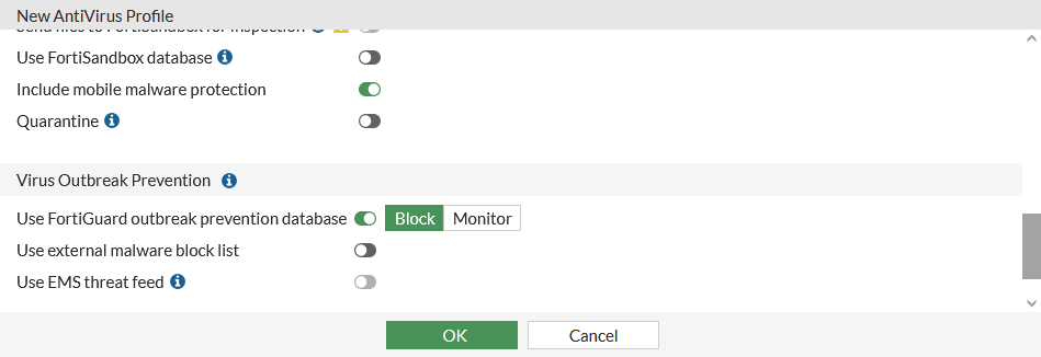 Under Virus Outbreak Prevention, enable Use FortiGuard outbreak prevention database and select Block or Monitor.