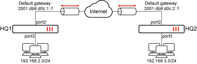 HQ1 port2 IPv6 address is 2001:db8:d0c:1::e and port3 IPv4 address is 192.168.2.1.