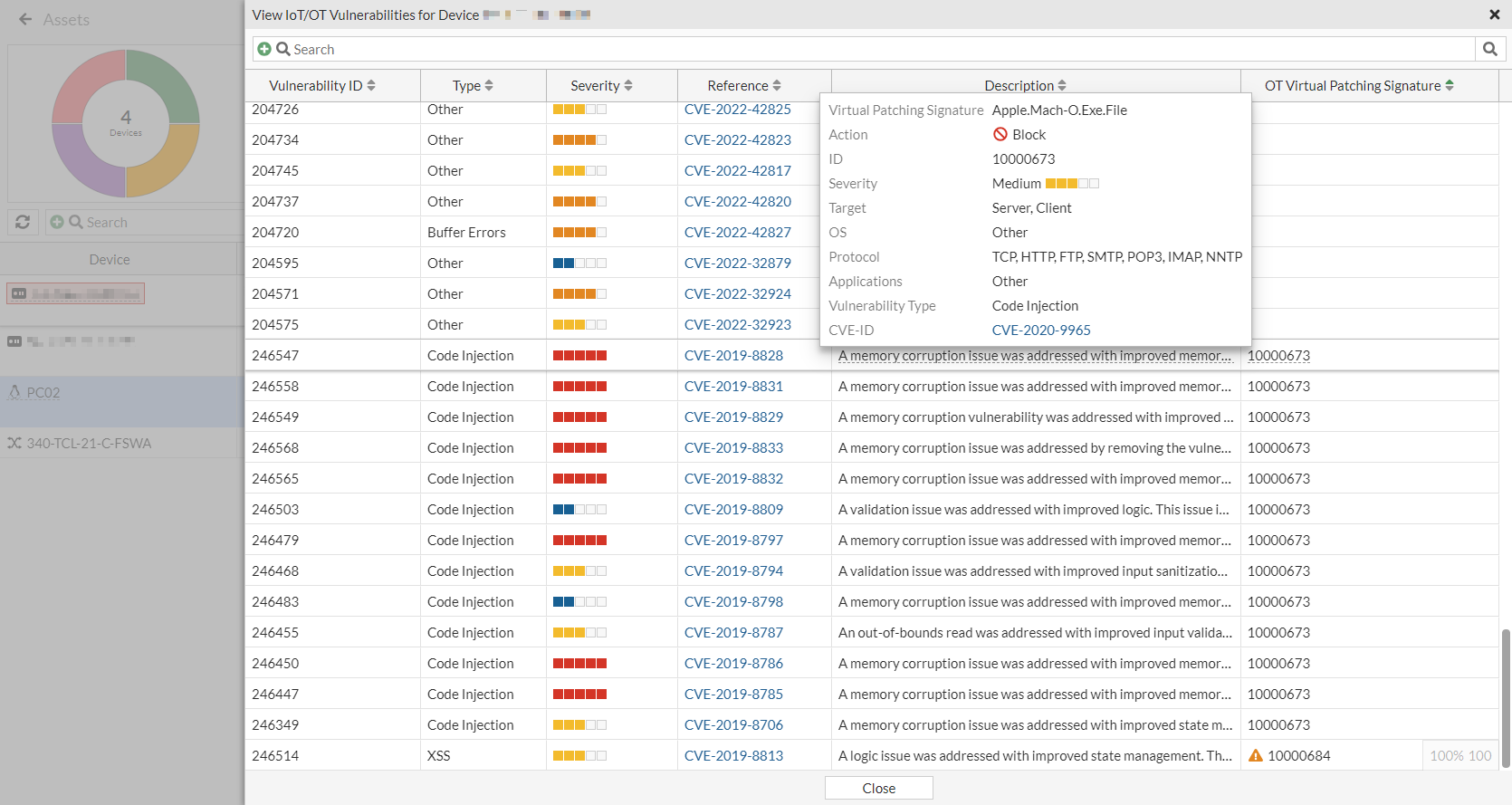 Clicking View IoT/OT Vulnerabilities in the tooltip displays a list of vulnerabilities retrieved from the FortiGuard API server for the device. The OT Virtual Patching Signature column includes the virtual patch signature ID that is mapped to the Vulnerability ID.